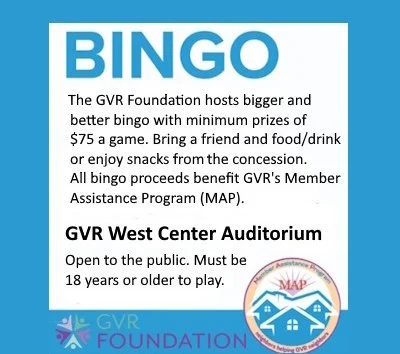 Our main fundraising activity is our bi-monthly Bingo game held at the GVR West Center. During our first year Bingo earnings raised $13,126 for the GVR Member Assistance Program.